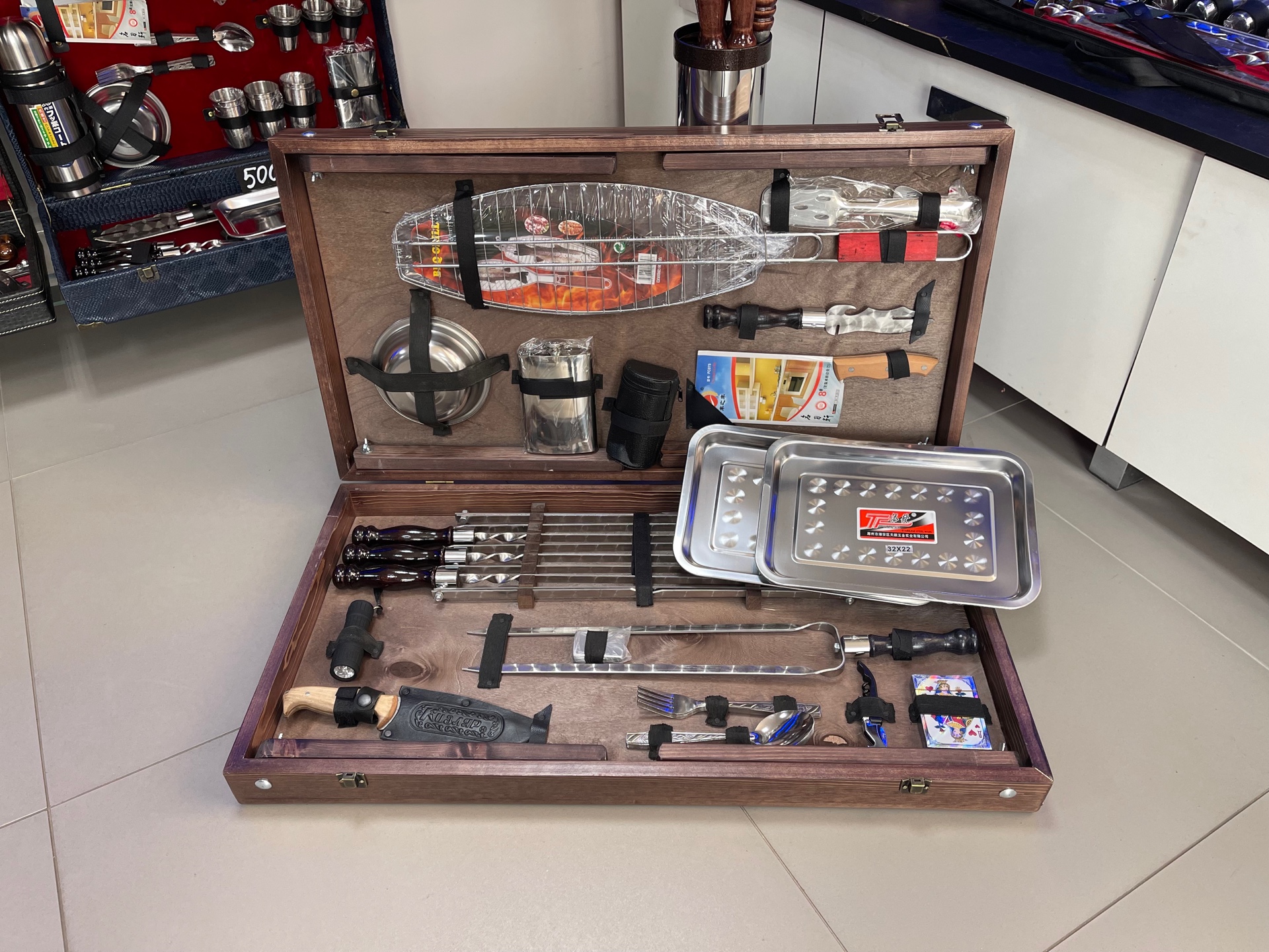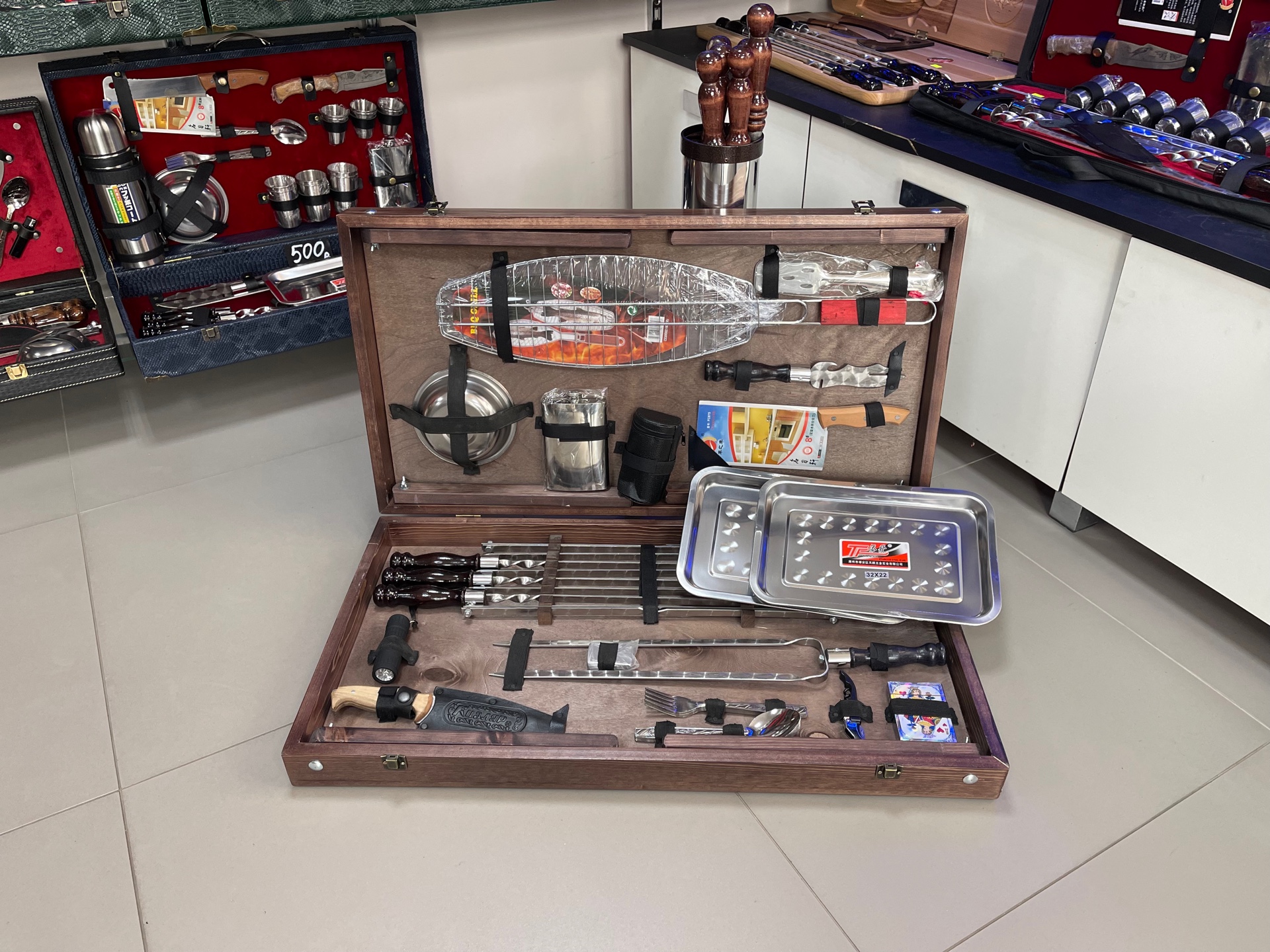 ✔️В наборе: 6 шампуров, походный мангал, шампур для курицы, зажигалка, колода карт, ножик открывашка, нож Кизляр, 6 вилок, 6 ложек, 6 тарелок, фонарик, решетка для рыбы, нож -вилка для снятия мяса, топорик, фляга, 6 стопок, щипцы, 2 подноса, чехол для набора.