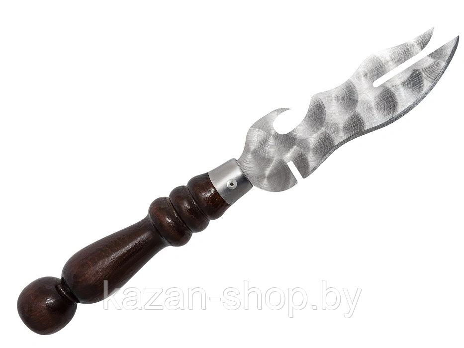 Нож для снятия мяса с шампуров из нержавеющей стали Aisi 430 с ручкой из дерева и колечком на конце, ручка пропитана морилкой и покрыта несколькими слоями качественного огнестойкого лака. Нож имеет режущую кромку для проверки готовности мяса и крюк для отвыкания банок.
